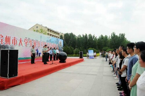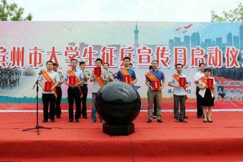 1506月2日,滨州市大学生征兵活动走进我校,征兵宣传月启动仪式在二餐广场隆重举行,太阳成集团tyc151cc2015级交通运输本科一班全体同学在辅导员桂晓亮老师的带领下参与了本次启动仪式。