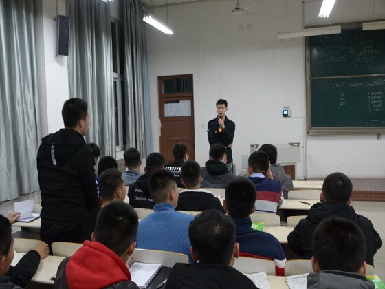 会上,大学英语四、六级考试成绩突出的学生代表首先分享学习心得。2017级飞行技术专业的陈冠兴、毛振权、赵峰、郭金剑、周荣彬、颜廷宇几位学生通过讲解音节记忆法、音标记忆法、词根词缀法扩充词汇量、做题应变能力、阅读文章理解语法、分类学习法等各个方面探讨了自身的经验及感悟。首次参加大学英语四级考试即取得600分优异成绩的王贺同学认为英语学习不是一门学科,而是一种生活习惯,只有真正有了英语学习的兴趣才能在学习中做到精益求精、深刻专注。2016级飞行技术专业的常洪清、邵迎春、李威、郭兆年、孙传兴、和天昊、孙勇、李宗奇几位学生通过调整考试心态、纠正英语发音、磨炼翻译句式、考题注意事项等雅思考试的复习与应试方法。在问答互动环节,常洪清、和天昊针对同学们学习英语的困惑与疑问做了详细的解答。最后,雅思成绩优异的李宗奇、和天昊为大家现场模拟了雅思口语考试场景,使同学们对雅思考试有了初步的了解与感受。