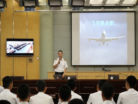 孟令光从飞行员生活中常被人问到的相关飞行知识谈起,结合自身丰富的飞行经历进行了风趣幽默的解答。此后,孟令光向大家分享了日常飞行工作中的流程及飞行专业相关知识。