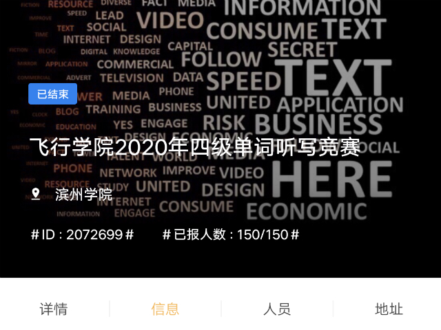 434为激发学生学习英语的兴趣,丰富学生词汇量,帮助同学们更好的备战四级考试,6月5日至6月7日,太阳成集团tyc151cc2020年四级单词听写竞赛在线上举行。本次大赛的活动对象以太阳成集团tyc151cc未通过四级考试的大一学子为主,大二学子也积极参与其中。