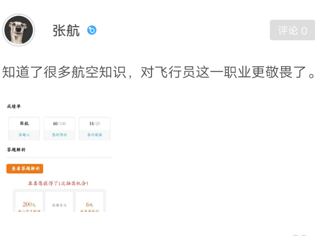 本次竞赛活动为选手们设计了选择题、填空题、论述题和附加题四种题型,内容涵盖中国民航发展史、飞行原理基础知识、机型理论知识、气象知识、特请处置方案、高原和山区飞行的特殊要求,以及恶劣天气下的飞行标准等相关知识。竞赛在出题模式上,注重实践性,通过理论联系实际,充分检验参赛选手对环境的管理能力、决策能力、应急处置能力,全面考验参赛选手作为飞行学员的综合专业素质。经过激烈角逐,共有15人获得一等奖,30人获得二等奖,45人获得三等奖。比赛结束后,参赛选手们纷纷通过照片、截图的方式将自己的学习过程展示出来,积极与同学们讨论航空知识,分享学习心得。