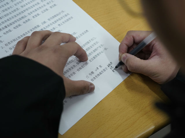 全体同学认真阅读消防安全责任书,学习了责任书中的内容:学生在教室中禁止使用危险物品,在宿舍中禁止使用大功率电器和明火,在自习和上课期间宿舍应关闭电源和用电器,做到人走断电等相关规定。最后,全体同学签订了消防安全责任书。