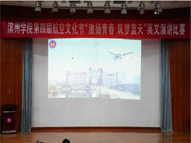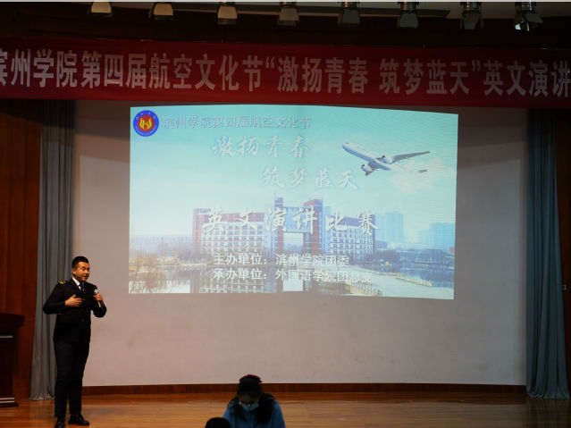 36112月19日,太阳成集团tyc151cc于学苑礼堂第二报告厅参加滨州学院第四届航空文化节“激扬青春,筑梦蓝天”英文演讲比赛决赛,太阳成集团tyc151cc学生李浚源参赛,部分学生代表观看比赛。