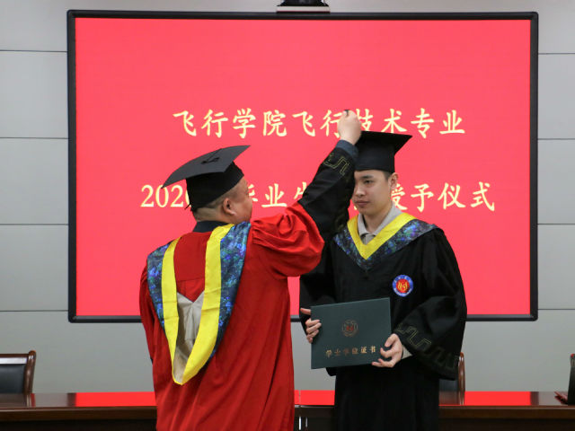 王同印首先祝贺同学们顺利毕业,对同学们在国内理论培训学习和国外飞行训练期间的学习成果表示认可,祝愿大家前程似锦、事业有成,希望大家在未来工作生活过程中团结一致、不忘初心、牢记新时代民航精神。他对毕业生提出了四点希望:做新时代民航人,要胸怀理想,坚定信念;做新时代民航人,要崇德修身、纪律严明;做新时代民航人,要满怀激情,无畏风雨;做新时代民航人,要知行合一,韧性十足。他寄语毕业生:“未来你们前行的道路上,面对挑战时,请多一点勇气,面对困难时,请多一点韧性,面对低谷时,请留一点希望。不管你们走得多远,母校永远是你们的精神家园;不管你们过得多累,母校永远是你们的温馨港湾。”随后,王同印、袁伟一一为毕业学生正冠拨穗,颁发学士学位证书,并合影留念。