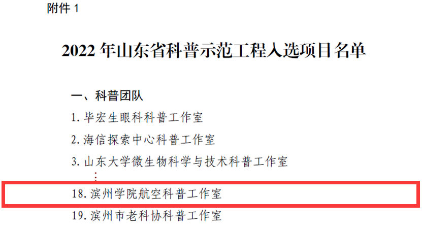 968近日,省科协、省科技厅公布并认定了第一批山东省科普专家工作室,全省共计214个,认定期为3年。我院申报的“滨州学院航空科普工作室”成功入选,并作为科普团队入选2022年山东省科普示范工程项目。