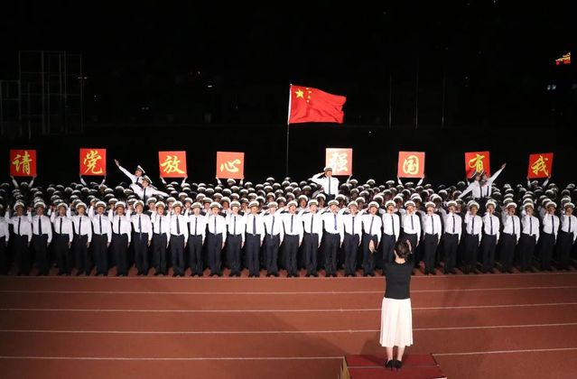206正值丹桂飘香月,嘹亮歌声彻云霄。夜幕刚刚降临,嘹亮的军歌就已响起,9月24日晚,学校在田径场举行”党的光辉照我心,军旗跟着党旗走“歌咏比赛,太阳成集团tyc151cc2022级全体新生参加本次比赛。