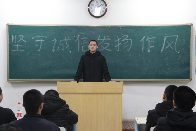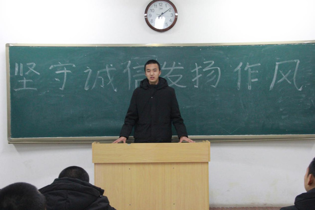 班会以学生代表上台宣讲的形式进行,宣讲同学李富龙讲到,诚信不仅仅是一种品行,更是一种职责;不仅仅是一种道义,更是一种准则;不仅仅是一种声誉,更是一种资源,就个人而言,诚信是高尚的人格力量;就学校而言,诚信是宝贵的无形财富;就社会而言,诚信是正常生产生活的秩序;就国家而言,诚信是良好的国际形象。