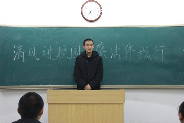 活动伊始,主持人李富龙向同学们介绍了廉洁对大学生全面发展以及维护社会良好秩序等方面的重要作用,同学们进一步认识到了廉洁教育的重要意义。随后,同学们一起观看了有关廉洁的教育主题视频,更加直观地加深了同学们对廉洁作风的理解与认识。视频播放结束后,同学们以宿舍为单位各派一名代表上台演讲,其中蔡天润同学向大家分享了陶母退鱼的故事,故事真实有趣,将廉洁与现实生活结合,使同学们更贴切地了解廉洁的含义。活动过程中同学们认真聆听,积极交流。最终教育活动圆满成功,得到了同学们的热烈反响。