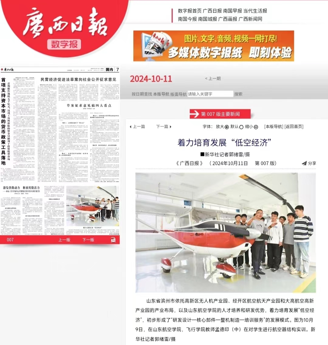 1135近期,我校依托人才优势,着力培育发展“低空经济”的成果引起了广泛的关注,产生了强烈反响,新华社、《科技日报》、《广西日报》等媒体平台相继关注报道,并详细介绍了学校在培育发展“低空经济”方面的实践情况。
