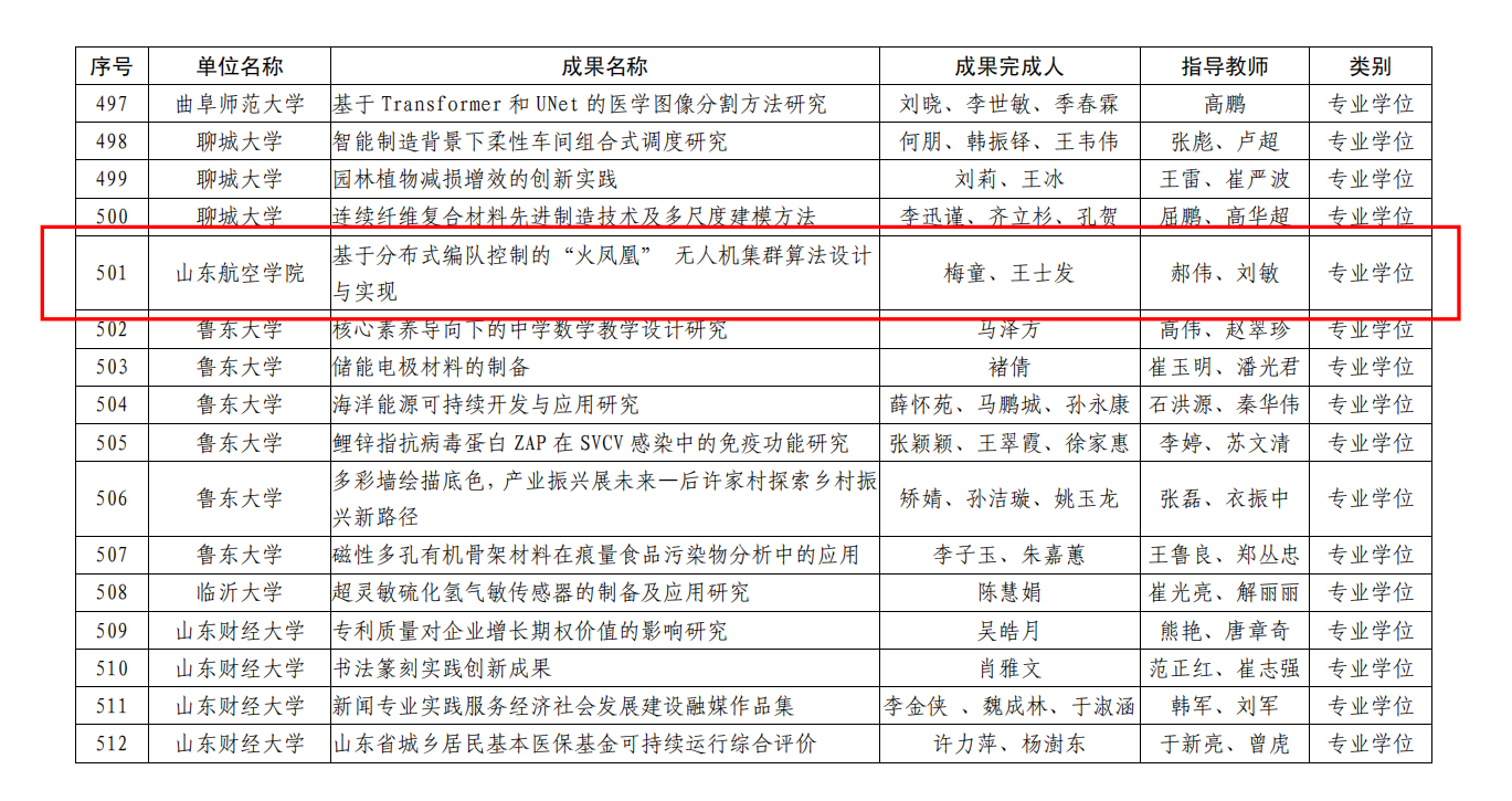 近日,山东省教育厅公布了2024年研究生教育各类项目的评审结果,我院2023级硕士研究生梅童、王士发完成的《基于分布式编队控制的“火凤凰”无人机集群算法设计与实现》获批山东省研究生创新成果(专业学位),这是我校首次获批该奖项,实现了我校研究生教育的重大突破。