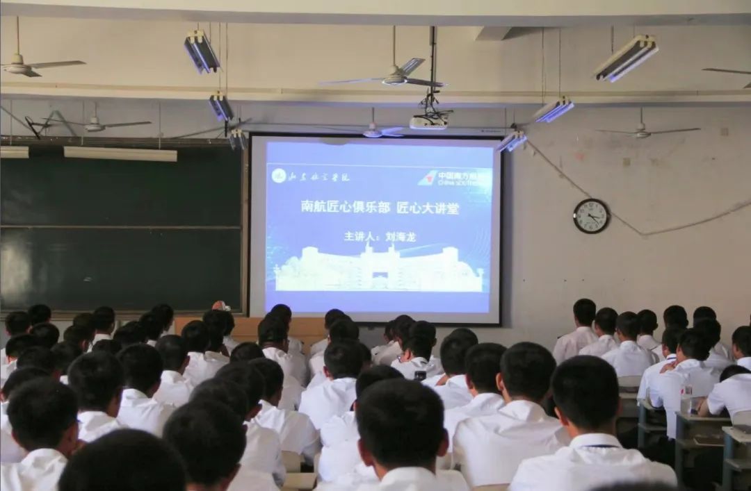 揭牌仪式后,启动南航匠心俱乐部首场大讲堂活动,由南航股份企业文化宣讲团成员刘海龙为2024级飞行技术专业、交通运输专业和航空服务艺术与管理等专业学生作“新时代‘阳光南航’”的专场报告会。