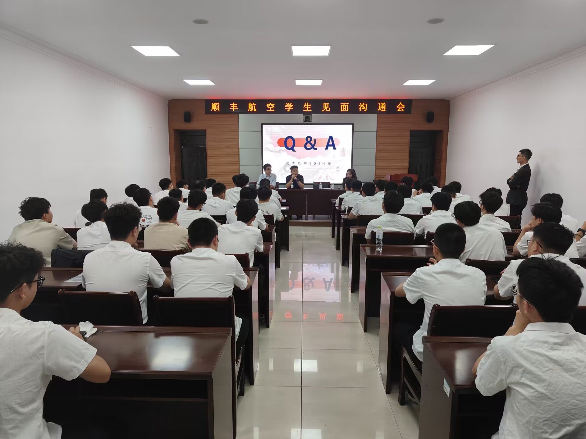 随后组织进行2025届毕业生校招推介交流会。邹青松为同学们详细介绍了顺丰航空公司的基本情况和2025届毕业生秋招基本要求、工作岗位、福利待遇、成长路径。他指出,顺丰航空非常注重员工的培训与成长,为员工提供了广阔的晋升空间和丰厚的福利待遇,欢迎有志于投身民航机务工作的大学生加入顺丰航空,实现航空职业梦想。会上,同学们就关心的职业发展方向、未来工作环境、晋升渠道以及在校学习中重点等问题进行了提问。