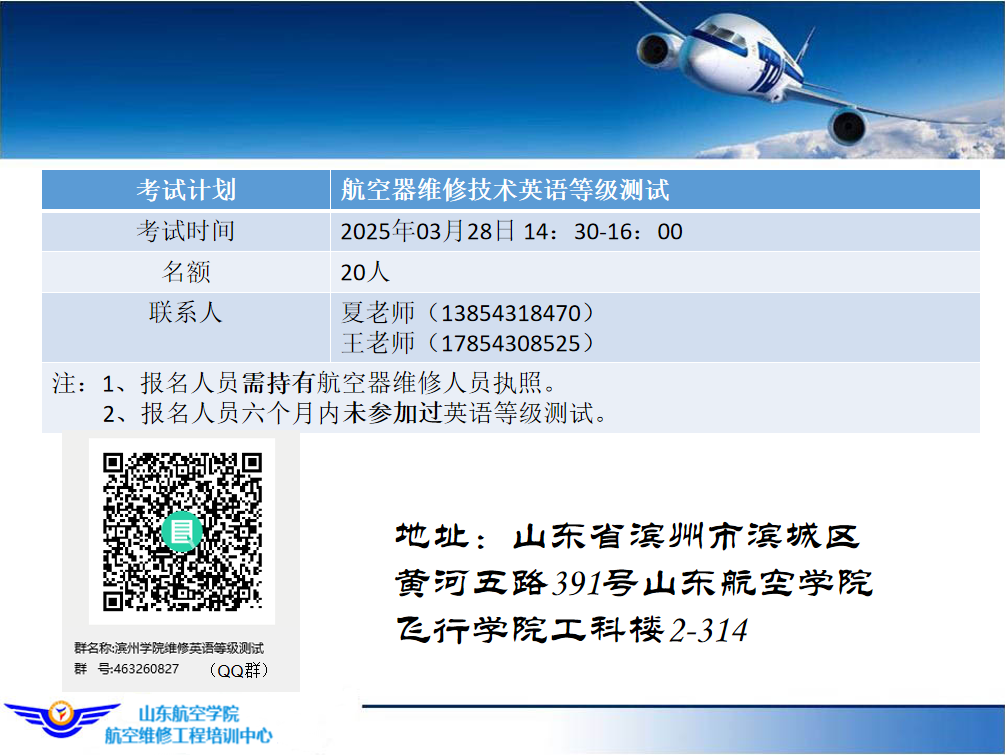 按照测试计划,培训中心将在2025年03月28日14:30-16:00组织航空器维修技术英语等级测试。计划参加考试的人员请扫描下方二维码或者拨打联系人电话申请报名。